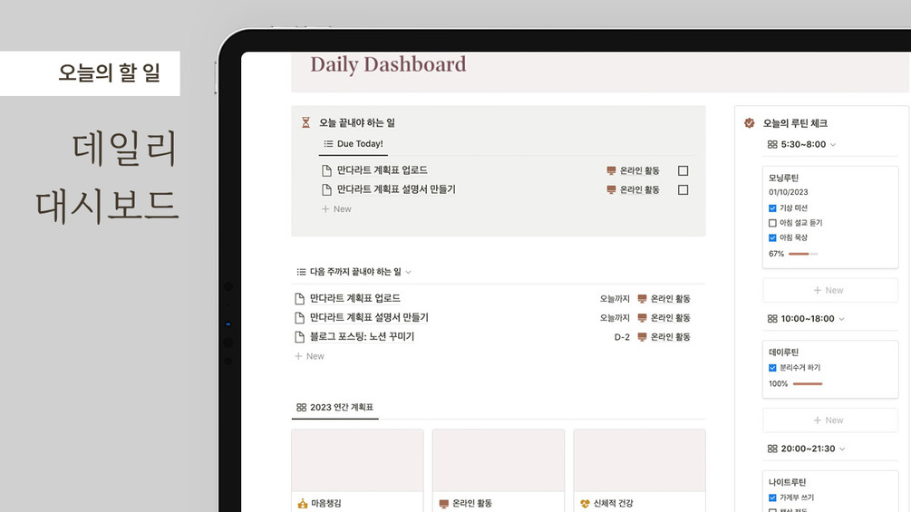 · 데일리 대시보드에서는 오늘 해야 할 일과 데일리 루틴을 확인하고 체크할 수 있어요.